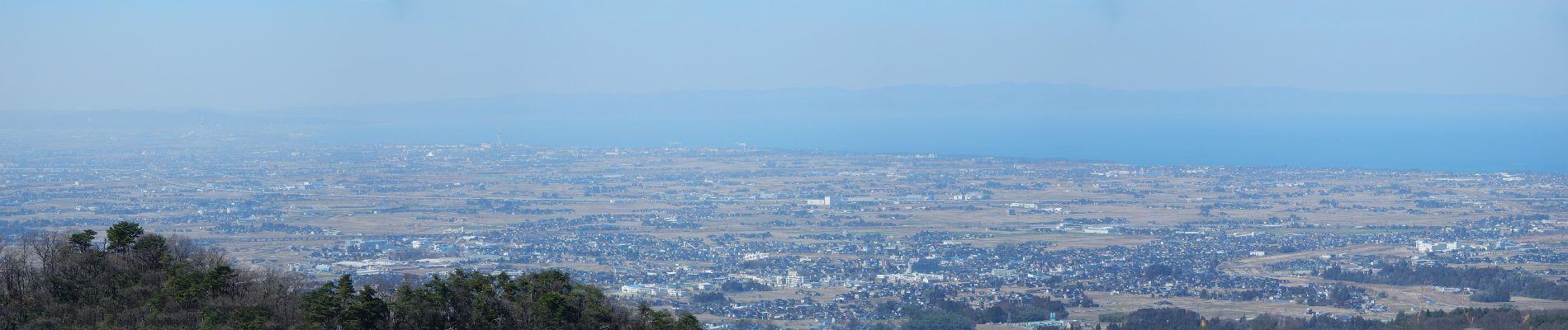 マンサク 山頂から見た 富山湾と遠くに富山市