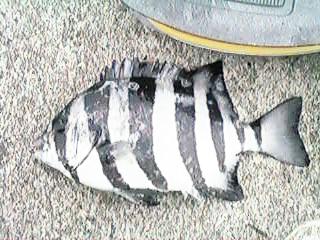 しかし状況は厳しく、あちこち探るもののエサ取りのあたりもない。先端付近を探りにでかけたシューちゃんを待ってカズさんと前打ち談義。しかし、シューちゃんなかなかもどらず、1時間位してタモにシマダイ(25センチクラス)をもって登場。