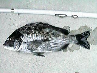 結局堀岡に入った時には8時半位。そのころから北風が吹き出して少し波立ってくる。ここも濁りが入っていてなんとかなりそうな雰囲気。左側部は、赤茶けた水が流れ込んでいてちょっと厳しい様子。案の定フグのオンパレード。右部に移動し先回アタッたポイント等を探るがエサ取りしかあたってこない。最右部普段特にフグの多いポイントでひったくるようなアタリで本命ヒットするが、小さく25センチ。隣にいたキス釣りのおじさんにプレゼント。(このおじさん結構良型のキスを釣っていた)その後中央付近でハリはずれのバラシ(多分25センチクラス)があったあとはアタリなく、納竿。