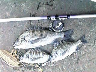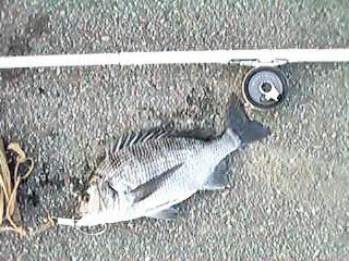 移動して30分くらいしてテトラ際でヒット。水深が1mくらいのために一気に下に潜られ穂先がずっぽりと水面へ。テトラ際に擦られ半分バラシを覚悟するがなんとかかわす。これはなかなかの型か? その後何度もテトラ際へ突っ込まれるうちに沖に走り出す。今日はR社のリールのため一気に糸だしし、限界でストップ。しばらく根に入ろうとするクロダイと綱引き状態をするうちなんとか手前に走ってくれて無事ゲット期待値は40オーバーながら惜しくも38センチでした。しかしながら馬力十分のファイトに感謝。その後リリースサイズを含み3枚がヒット。