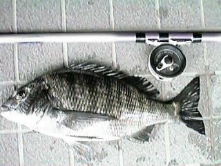沖テトラ帯のやや中央寄りまで移動し、沈みテトラ際に落とし仕掛けを上げようするとおやっという感じで聞き合わせをする。本命かな?と思ったところガツン引き込み。そしてグングンと沖へ走る。やった!久々の感触、若干糸を出すが結構重量感のある引きに久々に興奮状態。でも釣り座自体足場もよくさらに回りの障害物からはなんとかかわせそうなポイント。仕掛けのトラブルがなければなんとかなる、、そう思ってひたすら締め込みに耐える。一度左の根に入られそうになり、やばいと思うがその後なんとか浮いてくれたのであとはやや強引に寄せなんとか一発でタモ入れ成功する。タモの中のクロダイは久々故にサイズよりも大きく見えました。こんな日こそ、ネクストを狙うべきなのだろうが、狙い通りのヒット、完璧なやりとり、完璧なタモ入れ(自分でそう思っているだけだが)に自己陶酔してしまい大満足で納竿してしまいました。