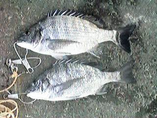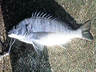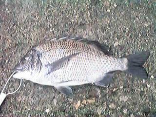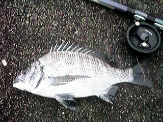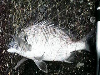 それから堀岡に戻りふたたび前打ち。濁りはほとんどないものの若干のうねりが出ており、少々期待。いままであまりヒットしていなかった右側テトラ際で待望のクロダイのアタリ。予感的中でにんまり、29センチ。
