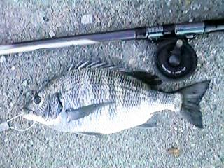 ら釣りはじめる。まだまだ気温低く、寒くエサを付けるのもやっとの状態。足下に注意しながら移動するが、エサ取りすらあたってこない。右半分をひととおり攻め、中央の突堤前のテトラに入る。流れのあるほうで待望のアタリ、しかし小さい。しかも本命ではなく、カンダイであった。20センチ位であろうか。これでここでカンダイ3匹目。長いこと釣りをしてるがはじめてカンダイ。クロダイよりも大きくなるし、引きも強いらしいのだがおいしいのだろうか?