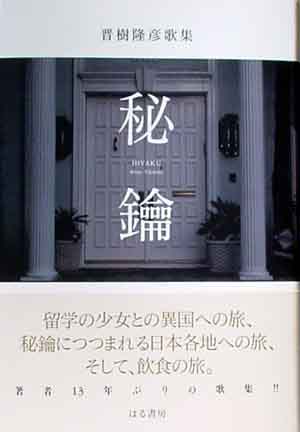 『秘鑰』!このタイトルは、「あとがき」によると、著者が「学生時代から好きだった北村透谷の「厭世詩家と女性」の一節<恋愛は人生の秘鑰(ひやく)なり、恋愛ありて後人世あり、恋愛を抽(ぬ)き去りたらむには人生何の色味かあらむ>からとった」とのことである。「あとがき」は次のようにつづいていいる。「『秘鑰』とは、秘密のかぎといおうか、それを明らかにする手段というべきか、意味とともに字もなかなかむずかしい。元気でいられるうちはパッションを燃えたたせ、飲み遊び、その上で、その力を仕事に還元させていきたい、というのが僕の人生の考え方である。」 トンボ採りの叔父さんのごとき風采の民俗学者鳥を指さす 閉山草(へいざんそう)とも呼ばれしかつて茫茫と反りかえる様を鉱夫は見しや 青海亀を肴に呑みて語らいし永井陽子さんの左のえくぼ 飽かぬもの五つあぐれば酒タバコ女人賭事啄木のうた 若者の美容室タローを贔屓にするオジサン我は長髪なれば 購読者欲ばらずよし小さくとも日日草のごとく花咲け 四〇〇年つづきしとも聞く朝市の器にカツオは銀の腹見す |