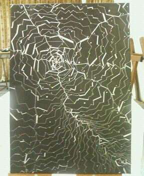 ギャラリーでの作品。タイトルは”光線”です。宇宙と言うものを主にコンセプトを作ったのではなく、人との繋がりであったり、生物、物、環境すべて関係を持っていることを忘れないで!と言うメッセージを込めて、宇宙空間を描きました。